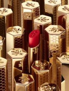 ケースは、アイコニックなゴールドの輝きはそのままに、よりスリムにアップデート。ハニカム模様をあしらったケースは、手にした時に指に馴染みやすく、持ちやすい形状に。キャップ部分にはミツバチの立体的なエンボス加工を、さらにリップスティックの先端にも同様の刻印を施している。